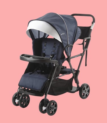 The Katoji Double Stroller is a lightweight, easy-to-maneuver stroller, designed for comfort and convenience with side-by-side seating for two.